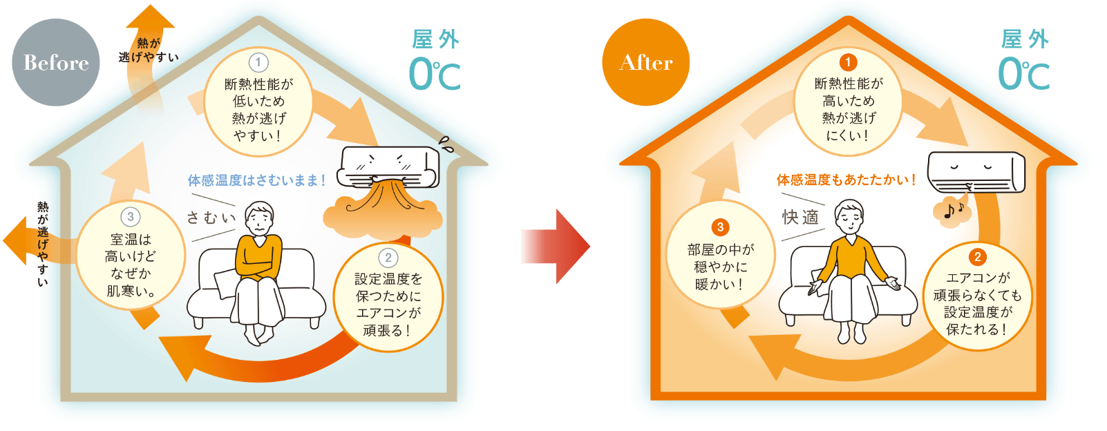 底冷えを感じやすい窓と床をはじめ、生活空間の断熱を改善し、快適な住まいに。