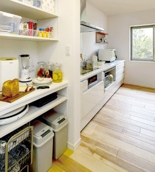 勝手口とキッチンをつなぐ場所にレイアウトすると、買ってきた食材をそのまま収納、さらにキッチンまで一直線で行ける配置だと片づけも楽チンです。